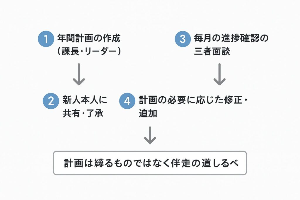 • 課長である私とリーダーで年間計画を作成し、新人本人にも内容を共有・了承を得る