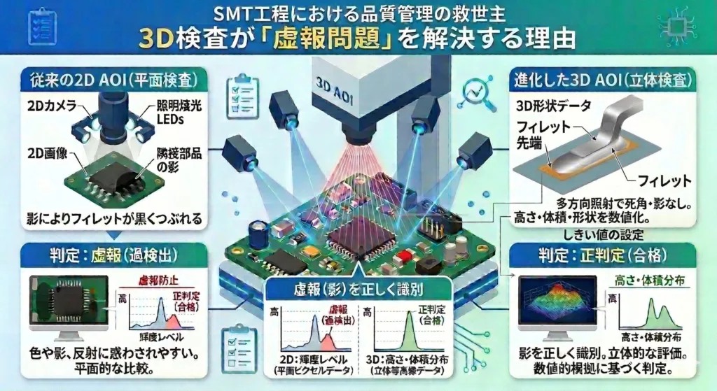 2Dでは「色」や「影」の濃淡ではんだを判断します。そのため、光の反射具合が変わったり、隣接する部品の影が落ちたりするだけで「はんだ不足」と誤判定してしまうのです。
