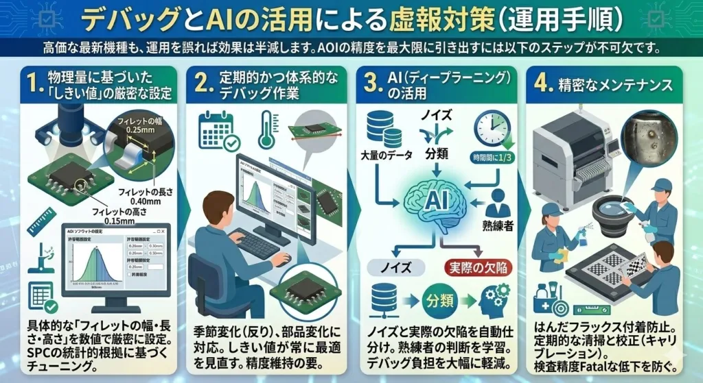 季節による基板の反りや部品の微妙な変化に対応するため、定期的なデバッグ(検査プログラムの微調整)が必須です。