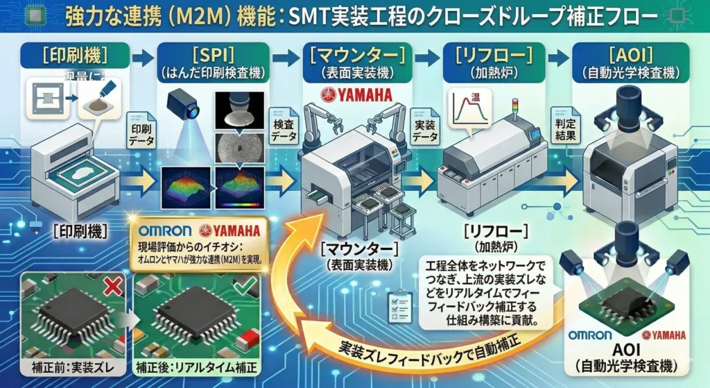 単体での検査性能の高さはもちろん、最大の決め手はSPI(はんだ印刷検査機)やマウンター(表面実装機)との強力な連携(M2M)機能にあります。