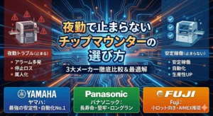 夜勤で止まらないチップマウンターの選び方 夜勤帯や小ロット多品種ラインでチップマウンターが止まる問題は、正しい機種選定で大きく改善できます。稼働率を落とさないメーカー・機種の違いを解説します。 この記...