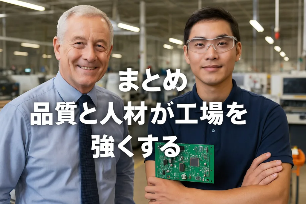 実装技術の進化は、設備や材料だけでなく、人の手と知恵によって支えられています。DIPやプレスフィットといった実装手法の奥には、確かな技能と改善を積み重ねる“現場力”があります。最終的に工場を強くするのは、品質を守る人と、それを育てる仕組みです。