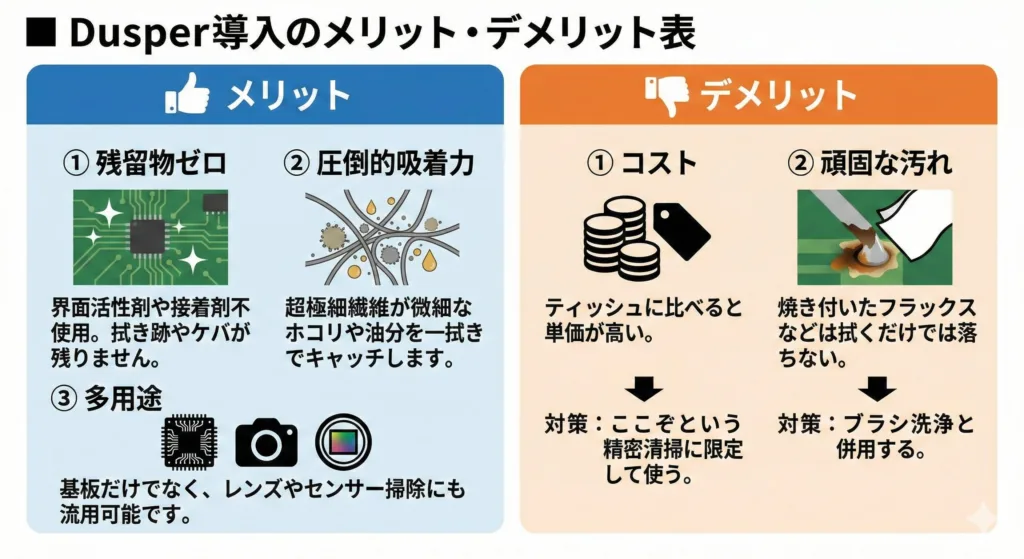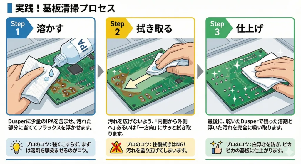 | Step 3 | 仕上げ | 最後に、乾いたDusperで残った溶剤と浮いた汚れを完全に吸い取ります。 | 白浮きを防ぎ、ピカピカの基板に仕上がります。 |