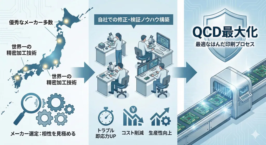 印刷不良(ブリッジやはんだ不足など)が発生した際、メーカーへ再製作を依頼するのと、自社で修正・調整を行う場合の違いを表にまとめました。