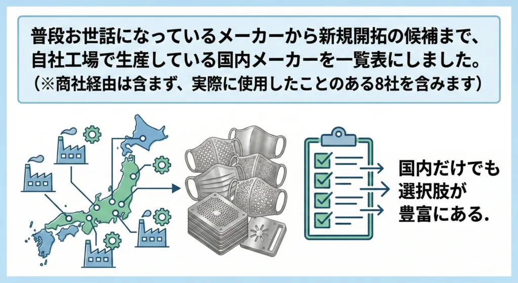 普段お世話になっているメーカーから新規開拓の候補まで、自社工場で生産している国内メーカーを一覧表にしました。(※商社経由は含まず、実際に使用したことのある8社を含みます)