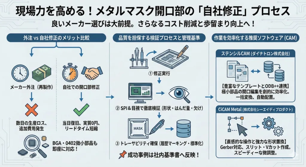 この記事では、国内の主要メタルマスクメーカーを紹介するとともに、QCDを劇的に高めるための「自社での開口部修正ノウハウ」について解説します。選定や運用に迷っている方のヒントになれば幸いです。