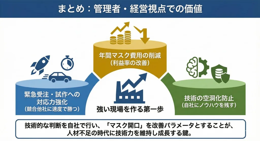 工場の人材不足が進む中、技術的な判断まで外部に丸投げすれば、自社の技術力は低下する一方です。 「マスク開口も自社の改善パラメータ」として扱えるようになること。これこそが、強い現場を作るための第一歩です。