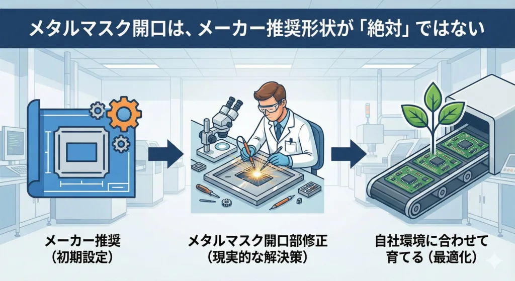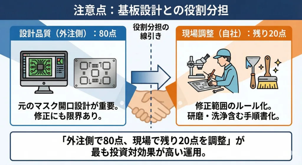 - 基板設計品質との線引き: 元のマスク開口設計が悪ければ修正にも限界があります。「外注側で80点、現場で残り20点を調整」という役割分担が、最も投資対効果が高い運用です。