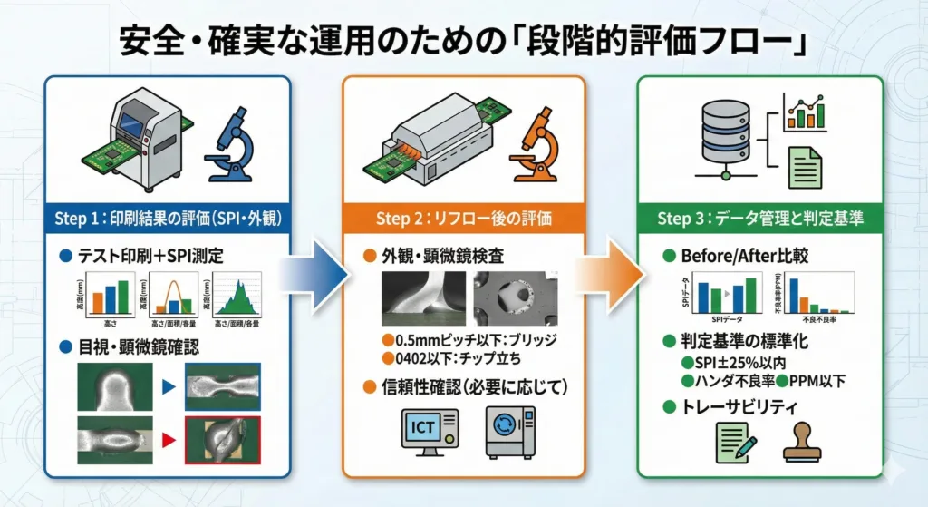 - テスト印刷+SPI測定: 修正箇所を含むテスト基板に数枚印刷し、3D SPIで高さ・面積・体積・位置ずれを測定します。ターゲット比(自社規格)内に収まっているか、統計的なばらつきがないかを確認します。