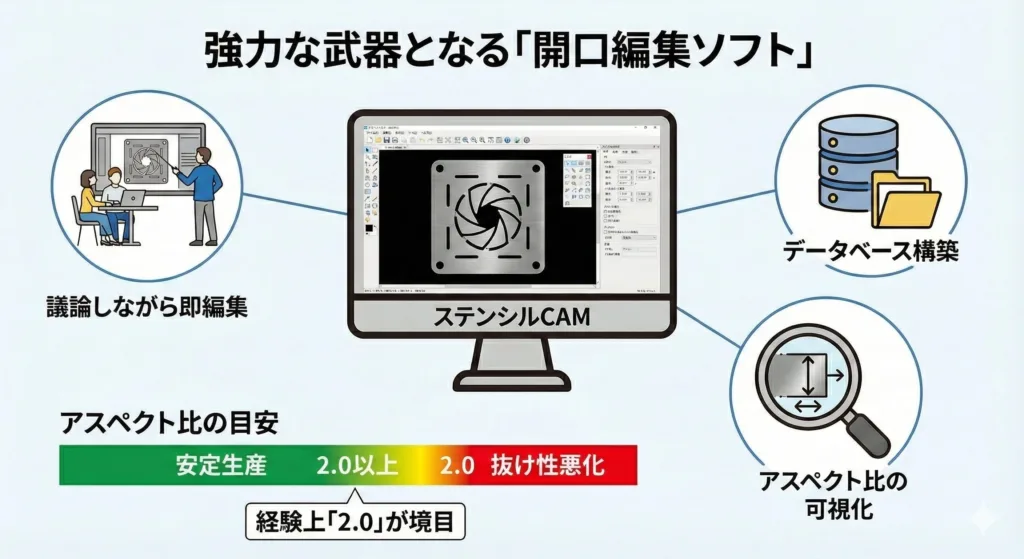 最新の【メタルマスク開口編集システム ステンシルCAM】など)。これらはメタルマスクメーカーも使用しているプロツールで、以下の利点があります。