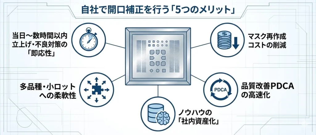 社内でメタルマスク開口修正を行うことは、単なる作業の内製化ではありません。