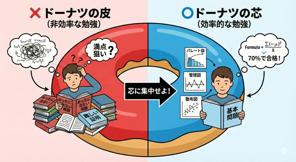 勉強を始めると陥りやすいのが**「ドーナツ化現象」**です。 これは、肝心な「中心部分(頻出問題)」が疎かなのに、「周辺部分(めったに出ない難問)」ばかり気になって勉強してしまう状態のことです。