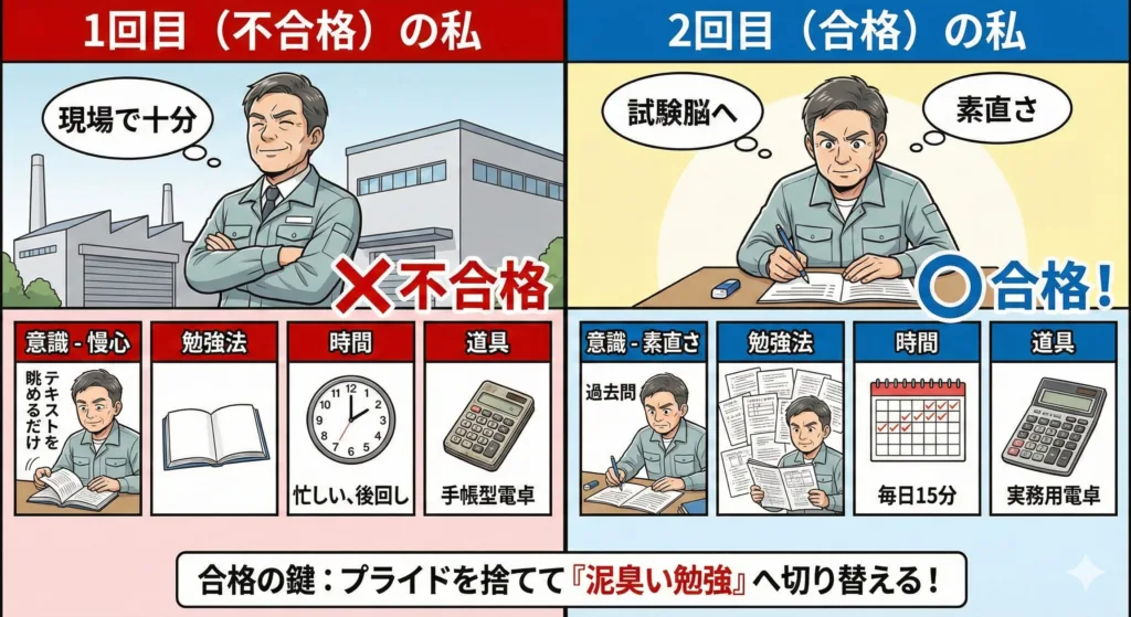 | 項目 | 1回目(不合格)の私 | 2回目(合格)の私 |