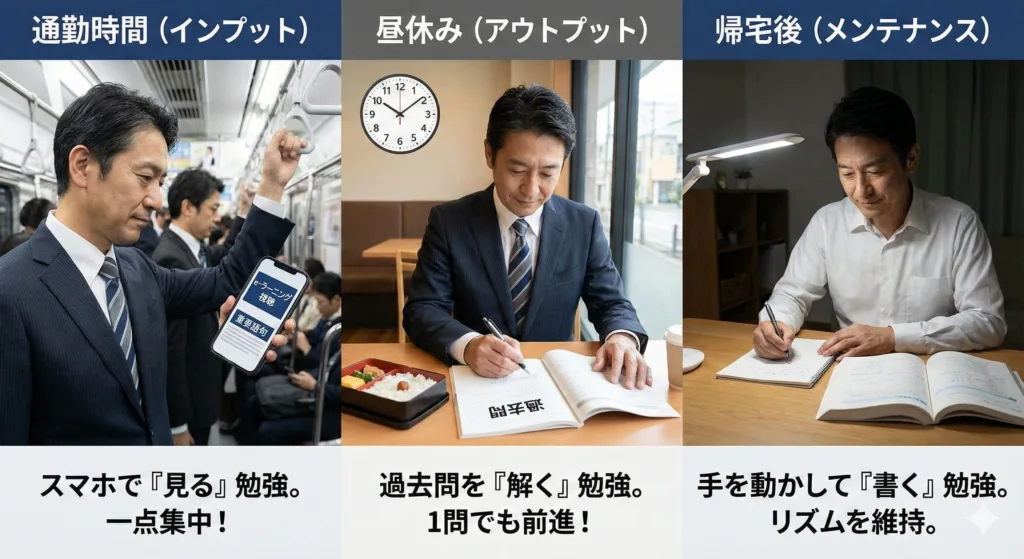 管理職の私たちには、学生のように机に向かって何時間も勉強する体力も時間もありません。 そこで私は、生活の「隙間」を徹底的に使いました。以下が私の「3分割ルーティン」です。