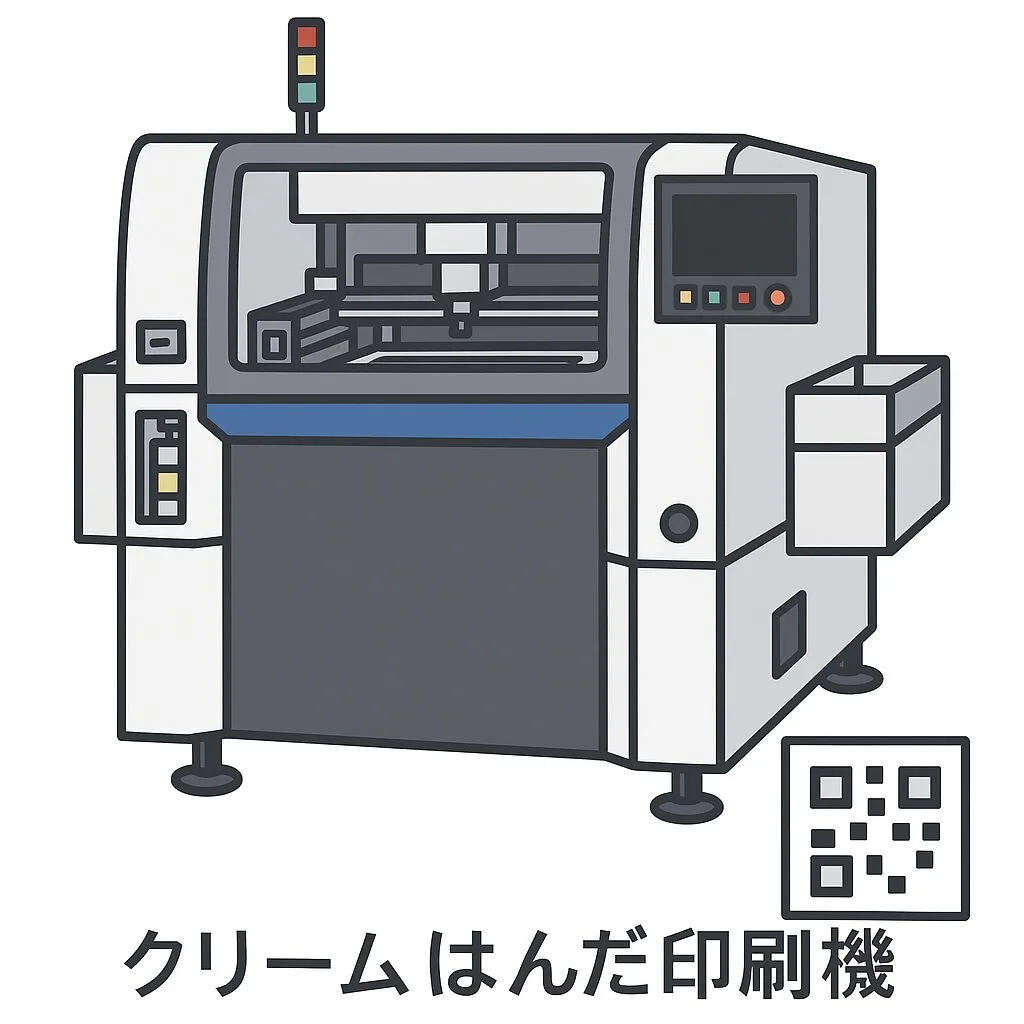 メタルマスクを使い、部品実装箇所にクリームはんだを印刷。SMT品質の7割を左右する最重要工程です。