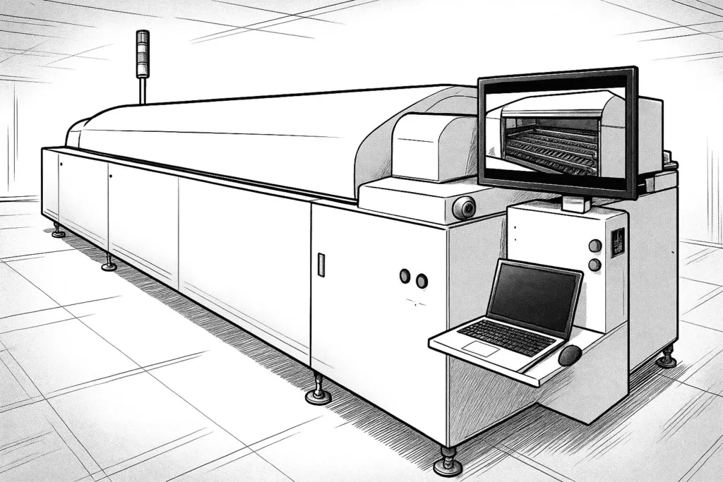 基板を加熱し、はんだを溶融して接合。温度プロファイル設定が技術力の指標となります。
