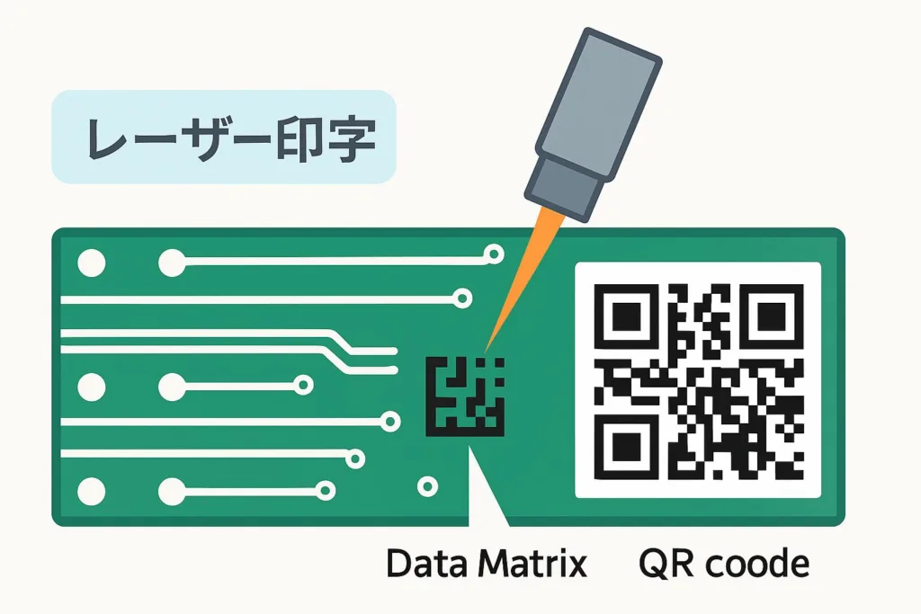基板にQRコードやデータマトリックスをレーザー印字し、トレーサビリティを確保します。