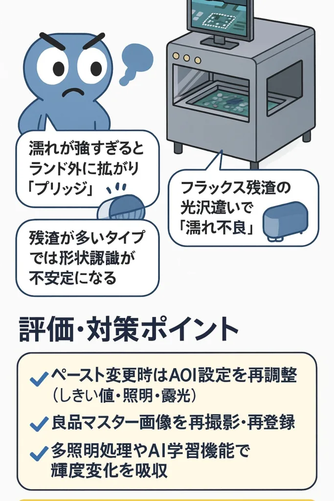 • ペースト変更時はAOI設定を再調整(閾値・照明・露光)