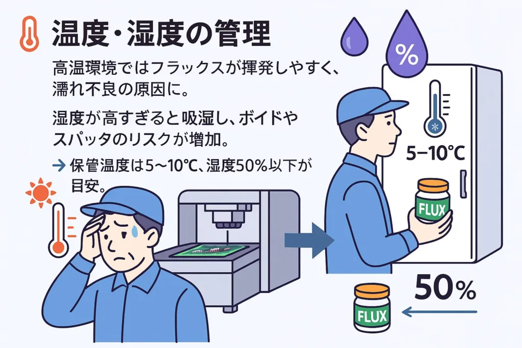 🌡 温度・湿度の管理・高温環境ではフラックスが揮発しやすく、濡れ不良の原因になる・湿度が高いと吸湿し、ボイドやスパッタのリスク増加・保管温度:5〜10℃・湿度:50%以下