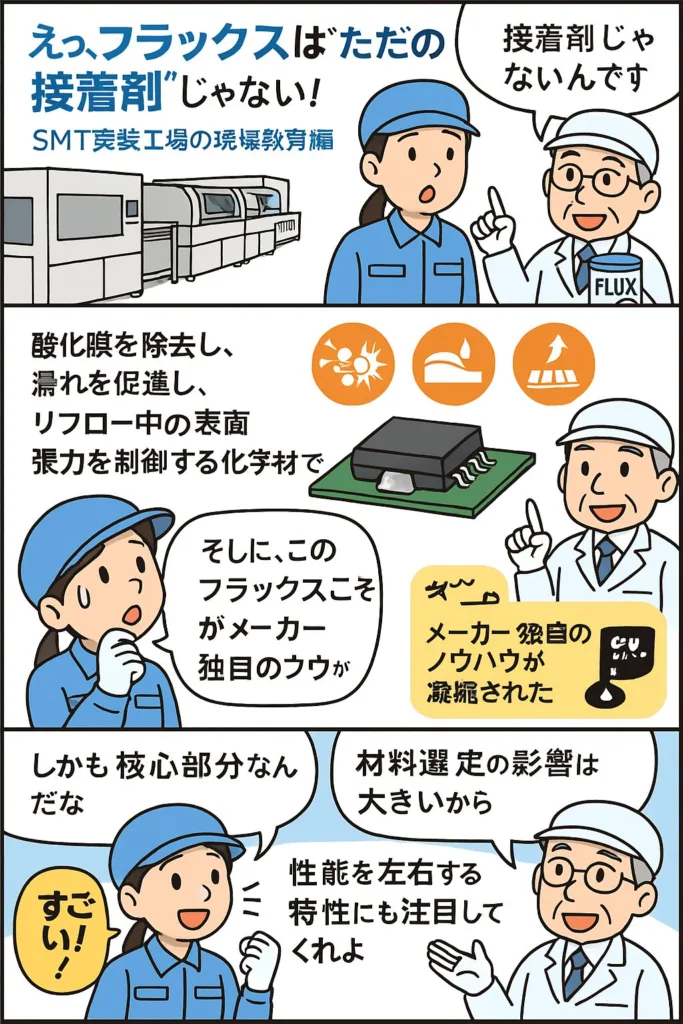 メーカーが何年もかけて最適化した化学設計が、クリームはんだの品質を決めています。