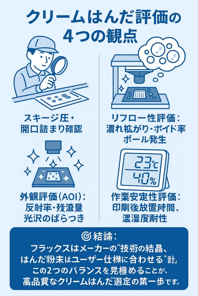 クリームはんだの基本構造から、保存・印刷・リフロー・評価・AOI適合までを体系的に解説します。