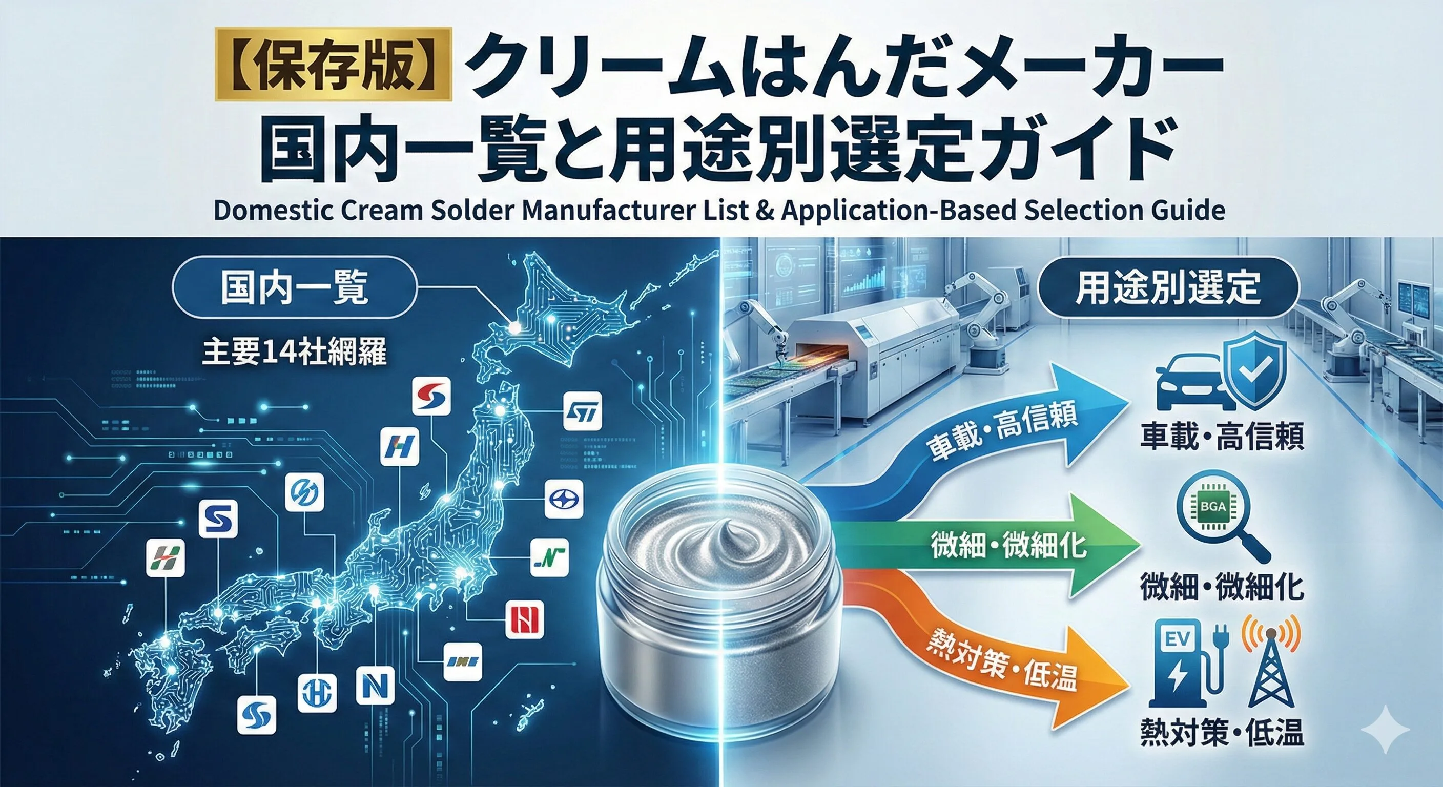 | 車載・高信頼 | 千住金属、ハリマ化成 MacDermid Alpha | 「125℃超の耐熱と振動耐性」 ・Alpha:独自のInnolot合金で過酷な環境に強い。 ・千住/ハリマ:国内実績No.1の安心感とAEC-Q準拠。 |