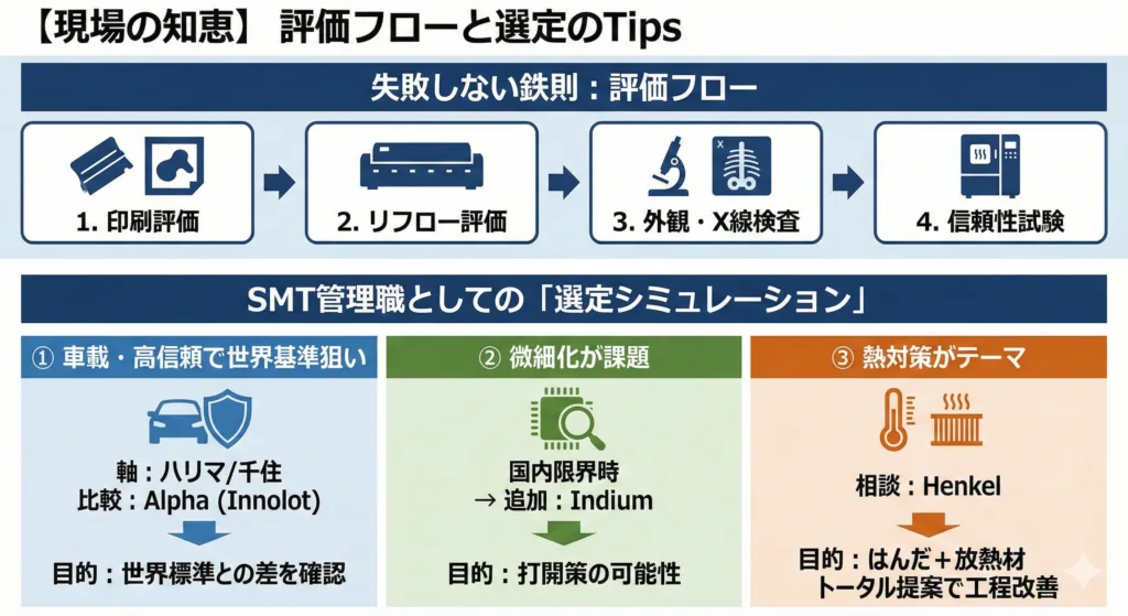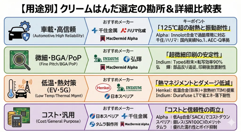 クリームはんだに「万能薬」はありません。 「車載なら信頼性」「微細なら印刷性」「熱対策ならヘンケル」など、目的(用途)に合わせて使い分けるのが鉄則です。