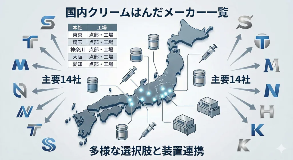 まずは、国内で展開している主要なクリームはんだメーカーを整理しました。 私自身がすべてのメーカーを使用したわけではありませんが、業界リサーチや展示会などで把握しているメーカーを含めて一覧化しています。地域性や特定のニッチな用途で強みを持つメーカーもありますので、選択肢として参考にしてください。