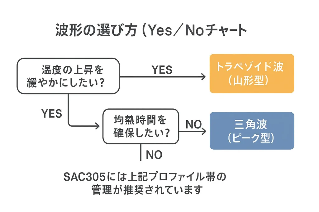 | 吸湿性の高い部品(ICなど)が多い | 🟧 トラペゾイド波(山形型) | 🔷 三角波(ピーク型)でも OK |